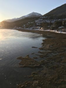 It’s low tide: along the right side of the view, Douglas Island’s exposed tideflats show as a black shadow between the sunlit water and the snow above the high tideline. Gulls and shorebirds will be feeding here among the blue mussel-kelp beds, just as they do below the Douglas Bridge.